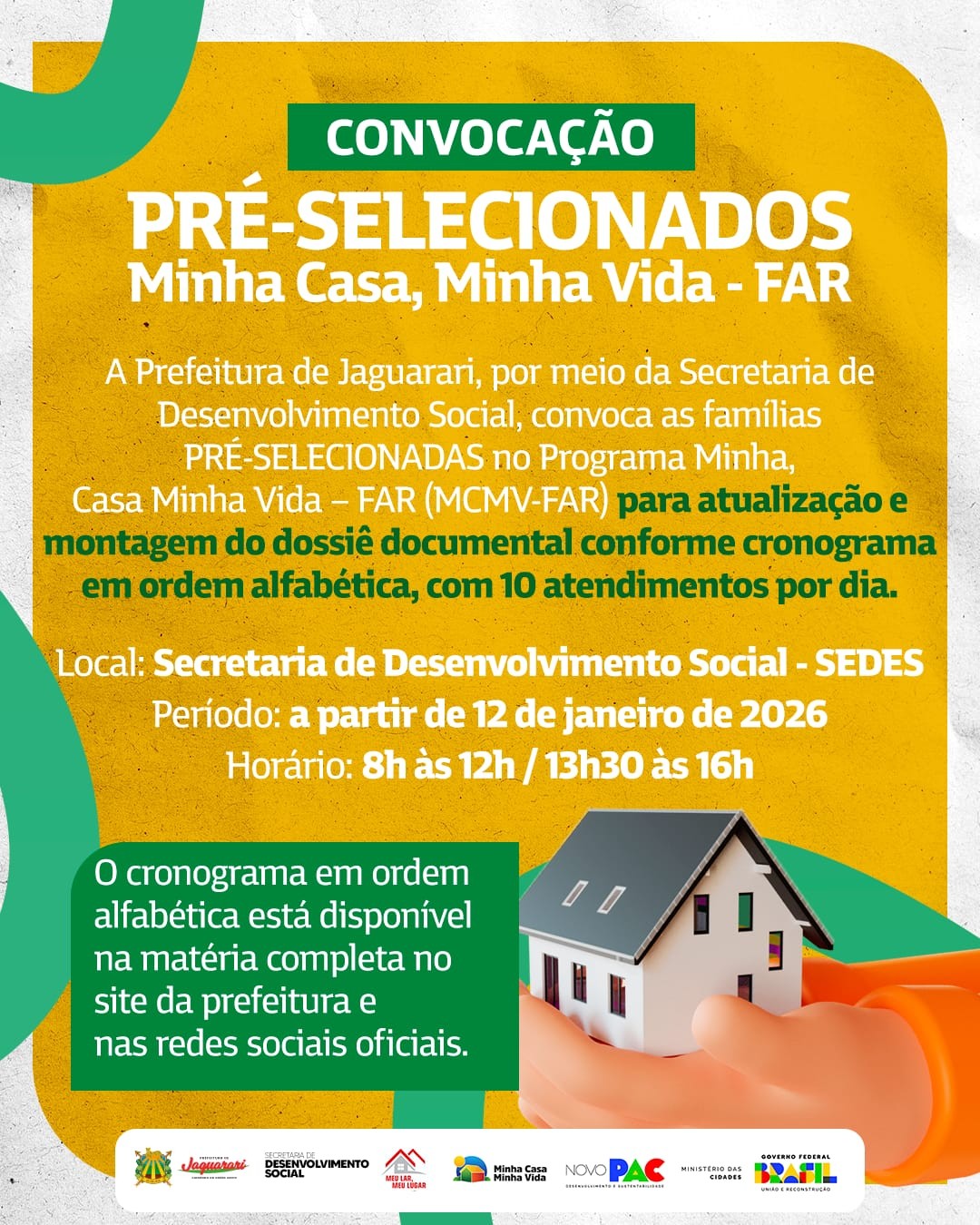 A Prefeitura Municipal de Jaguarari, por meio da Secretaria de Desenvolvimento Social, CONVOCA as famílias PRÉ-SELECIONADAS no Programa Minha Casa Minha Vida - FAR (MCMV - FAR) para atualização e montagem do dossiê documental, conforme cronograma em ordem alfabética, com 10 atendimentos por dia.